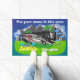 This doormat can be customized to show your name on top. When used outside of your RV, people will know who they are talking to when they see you. Non-slip rubber that won't crack or buckle, this mat resists fading, mould, and mildew and can be easily cleaned with a hose. This version has a red Class A RV similar to a Thor Palazzo. It can be used indoors or out and makes a great welcome mat for your campsite, wherever you may go.