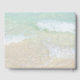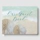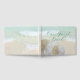 Livre d'hôtes mariage avec thème plage et deux dollars de sable design. Un script tentaculaire en bleu-vert est "Our guest book" sur un arrière - plan de sable de plage avec deux dollars réalistes de sable naturel.