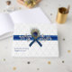Chic blanc sur blanc mariage damassé invité signe dans le livre avec des graphiques un ruban bleu clair, au milieu. Les graphismes d'un floraison d'argent et de perles fantaisie, à l'avant du livre d'hôtes, sont décorés d'un arc de couleur bleu et de plumes de paon et de satin. Personnalisez le texte pour votre journée spéciale.