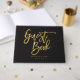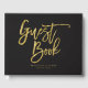 Livre d'invité mariage à effet feuille noire et or avec texte changeable où vous pouvez ajouter le nom de la mariée et de la mariée et la date du mariage, imprimé sur l'arrière - plan noir
