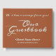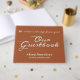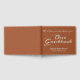 Ce livre d’or conservateur présente les messages "Notre livre d’or" et "Nous aimerions recevoir un message de votre part!", ainsi qu’une date et un nom d’événement/d’occasion personnalisés. Le texte est de couleur cyan clair, et l'arrière - plan est de couleur sienne. Un livre d'or générique et personnalisable comme celui-ci pourrait peut-être être utilisé lors d'un événement tel qu'une réunion de famille, une fête d'anniversaire, un baby shower ou un autre événement.