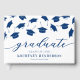 Livre d'or moderne de la fête de remise de diplômes avec un simple arrière - plan blanc qui peut être changé à n'importe quelle couleur, casquettes en carton bleu, et un modèle de texte moderne qui est facile à personnaliser.