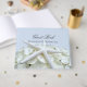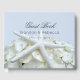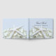 Livre d'hôtes mariage sur la plage avec étoiles de mer blanches et fleur d'hydrangée. Personnalisez avec les noms et la date mariage sur un arrière - plan bleu clair. Correspond aux produits de la ligne design Seaside Garden.