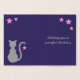 Caricature en silhouette d'un chat. L'avant a le chat en feuille. L'intérieur a un chat gris aux yeux roses. Une étoile rose est suspendue à la queue du chat. Sur le recto de la carte on peut lire "Joyeux anniversaire" et à l'intérieur on peut lire "Je vous souhaite un joli anniversaire"