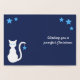 Caricature en silhouette d'un chat. L'avant a le chat en feuille. L'intérieur a un chat blanc aux yeux bleus. Une étoile glacée est suspendue à la queue du chat. Sur le devant de la carte on peut lire "Joyeux Noël" et à l'intérieur on peut lire "Je vous souhaite un Noël parfait"