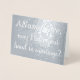 Cette élégante proposition de mariage en papier argenté personnalisé présente un message comme "ANameHere, puis-je prendre votre main dans le mariage?" sur le devant, où le nom peut être customisé. L'intérieur comporte un message personnalisé de proposition de mariage. Une carte de voeux comme celle-ci pourrait être utilisée pour demander à quelqu'un d'épouser l'expéditeur.