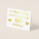 Cette carte de voeux d'anniversaire en feuille d'or affectueuse comporte un message comme "A-Name-Here, nous vous souhaitons un joyeux 98ème anniversaire!" sur le devant, où le nom et le numéro d'anniversaire peuvent être personnalisés. L'intérieur comporte un message d'anniversaire qui peut être customisé. Une carte d'anniversaire comme celle-ci pourrait être remise à quelqu'un qui fêterait un anniversaire.