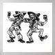 Two friendly skeletons in suits and sombreros dancing. In the style of Posada.
