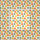 This fabric has a geometric design of dots in coral, gold, and sage green.