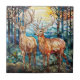 This ceramic tile has an image of two beautiful antlered buck deer standing in a forest with light on the mountains behind them. Predominant colours used are tones of blue, gold, brown, and green. A stained glass looking overlay gives added interest to the design.