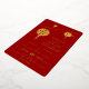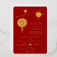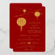 An original illustration of elegant and chic double happiness lanterns in modern kanji / chinese writing hanging on strings of fairy lights, on a simple red colour background, with real foil pressed, wedding invitation design. A stylish and classy chinese / asian / oriental themed outdoor / garden wedding design for the contemporary chinese couple.