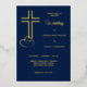 This beautiful wedding invitation in your choice of gold, silver, or rose gold foil and navy blue gives a sense of elegance to your wedding! The front left has a beautiful double line cross with two hearts at the foot of it. Your wedding text is at the right of the image. Everything is placed on a navy blue background. The back of the invitation is also navy blue. Elegant for any season!