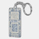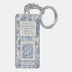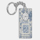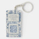 An elegant blue toile keychain designed to make QR codes aesthetically pleasing, so your promo materials will have extra appeal. The keychain is double-sided, with two separate QR code fields, each with its own subtitle for clarity. Link to two different websites, like one for payment and the other for social media; or simply input the same link on both sides of the keychain for ease of use. There is also a spot for you to input your logo on the front, and another for business information on the back.