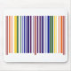Geometric barcode design features two rainbows made of pairs of coloured stripes that correspond to UPC numbers. Getting my geek on, the numbers correspond to the letters in "rainbow" to make a double rainbow. Since barcodes are only 12 numbers long, I let the "r" be represented by the red start and middle stripes. The sequence starts on the left with red, orange, yellow, green, blue, indigo, and violet. Two stripes of red serve as a divider in the middle and then the colours go from violet back to red for a balanced look.