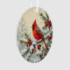 A beautiful double=sided Christmas ornament. Each side has a pretty illustration of cardinals. One on a bird house and the other on a pretty snow covered pine branch with red berries.