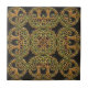 This embossed look tile design features a repeated pattern of two interwined trees of life in light brown,gold, and green on a black background. They design seems similar to a Celtic knot or other ancient pattern. This design appears to have embossed depth but is printed flat on the ceramic tile. This tile is even on both side, so can be used in a repeat tile accent pattern or used as a single decorative item for home decor.