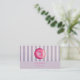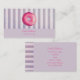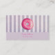 A business card template with a yummy illustration of a pink frosted doughnut with colourful sprinkles. The background has a vintage style pattern with faded purple stripes. Cute and stylish design for a baker, bakery or other doughnut themed businesses.