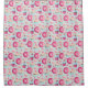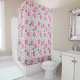 A yummy looking shower curtain with a delicious pattern design. Glazed pink doughnuts with sprinkles. Mouth watering cupcakes in pink and blue with rosettes and strawberries on top. Some pastel pink french pastry macarons and little pink candy buttons also decorate this pattern full of sweet treats.