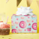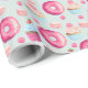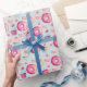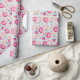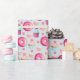 A yummy roll of wrapping paperwith a delicious pattern design. Glazed pink doughnuts with sprinkles. Mouth watering cupcakes in pink and blue with rosettes and strawberries on top. Some pastel pink french pastry macarons and little pink candy buttons also decorate this pattern full of sweet treats.