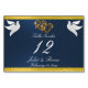 Ce design se compose d'un élégant arrière - plan bleu avec des bordures de ruban, des coeurs et des colombes reliés avec un lieu pour le numéro de table, les noms du couple et la date de l'événement. Disponible en plusieurs couleurs de thème mariages. (Le ruban est simulé dans l'illustration). Conçu pour coordonner avec la collection Mariage "Two Shall Become One - Silver & Gold". Pour modifier les détails, cliquez sur "Personnaliser". Pour déplacer le texte ou modifier la taille, la police ou la couleur du texte, cliquez sur "Cliquez pour customiser plus loin".