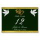 This design features an elegant emerald green background with ribbon borders, linked hearts & doves with a place for the table number, couple's names and date of event. Available in several wedding theme colours. (Ribbon is simulated in the artwork). Designed to coordinate with the "Two Shall Become One - Silver & Gold" Wedding Collection. To change details, click «Personalize». To move the text or change the text size, font, or colour click «Click to customize further».