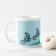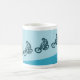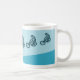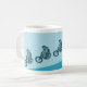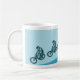 A down hill mountain bike doing massive jump around the outside of this coffee cup. The images is in shades of blue. I drew this bike by hand and then redrew it as a vector image. The image using white space technique to help form the rider and his rig.