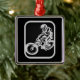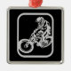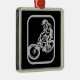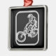 A downhill mountainbike and rider. The bike is drawn in grey, using "white space" technique on a black background. The rider is going down hill and is given perspective by the front wheel of the bike looking larger (closer) than the rear.