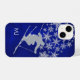 Here's the perfect phone case for anyone who loves to downhill ski! It features a silver grey snow skier with a cascade of pretty silver snowflakes around him. At the bottom left is your monogram, also in silver. The image and text are placed on a vivid royal blue gradient background.