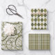 This collection of wrapping paper sheets features three varied patterns with a drab olive, loden and khaki colour theme-- funky intertwined loops pattern, argyle pattern, and plaid pattern - by katz_d_zynes