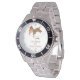 Has heft and feel of expensive stainless steel quartz watches. Good band with safety catch. I removed links, which is easy because engraved arrows show direction to push the linking pins. As always by this seller, the image (a railroad logo) is a perfect reproduction of my emailed image, and is precisely spaced and aligned.