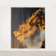 Dragon head with red eyes in the dark sky with smoke or clouds coming up.