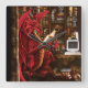 Red dragon sitting in his computer den reading a book. In behind there is podcasting equipment and a computer on his desk