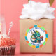 Blue, green, yellow and orange dragon themed boy's birthday party stickers. Cute for any little boy who loves dragons! Cute cartoon dragons in birthday hats holding birthday cakes.