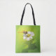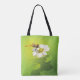 A dragonfly hovering above a white flower. This design looks really effective on this Tote Bag