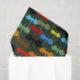 A wing group of dragons in the colours of black, brown, red, orange, yellow, blue, and green fly open wings across a deep dark green backdrop soaring upwards. The dragons are drawn in a tribal tattoo style.