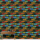 A wing group of dragons in the colours of black, brown, red, orange, yellow, blue, and green fly open wings across a deep dark green backdrop soaring upwards. The dragons are drawn in a tribal tattoo style.