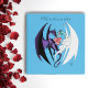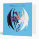 A purple dragon and a white dragon in the air with a Celtic pink and red heart between them in a backdrop of blue.