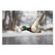 Drake mallard flying over the snow covered winter landscape of Northern Minnesota.