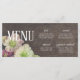 Menu card featuring live spring blooms in moody and muted tones against a dark walnut wood backdrop. Simple whit text lets your guest know what is in store.