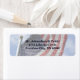 Ce design patriotique présente une photographie doucement ciblée du drapeau américain rouge, blanc et bleu volant en hauteur dans un ciel bleu vif.