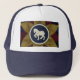 Centerpiece of a red, yellow and blue horse show rosette featuring a draught horse in gold.
