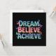 Nurture a brighter mindset with this uplifting "Dream, Believe, Achieve" greeting card featuring whimsical, colourful butterflies and motivational lettering. This cheerful artwork encourages mindfulness, self-love, and personal growth, making it a perfect gift or personal reminder to stay positive and spread good vibes. This butterfly-inspired design brings beauty and encouragement to everyday life.