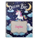 Let your imagination soar with the "Dream Big" journal cover! This enchanting design features a magical night sky filled with twinkling stars, a glowing crescent moon, and soft, fluffy clouds. A friendly unicorn with a rainbow mane prances on a cloud, adding a whimsical touch. A decorative frame or blank box at the centre allows for personalization with a name or special details. Perfect for dreamers, unicorn lovers, and anyone who enjoys writing, doodling, or journalling their biggest dreams!