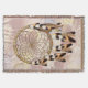 A dream-catcher design with a gold & brown trimmings that includes a round bamboo circle web of life with brown tones feathers and red beads on a soft feather background.