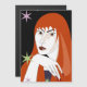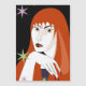 Beautiful girl with red hair on black night with colourful stars background