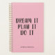 Un planificateur branché pour vous aider à mettre vos objectifs en pratique. Il s'agit d'un design typographique simple avec l'expression "Dream it, Plan it, Do it" en brush noir en caractères de style sur un arrière - plan rose bébé. Personnalisez avec votre nom ci-dessous. Fait un grand cadeau.