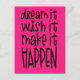 Send someone special words of motivation with this fun typographical design with the inspiring quote Dream It Wish It Make It Happen in a funky font style In black on a hot pink background which can be changed to another colour if you so wish.