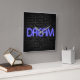Illuminated urban brick wall with DREAM text in glowing purple neon lights.