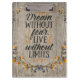 Motivational typography style quote "Dream without fear, Live without limits", floral elements on wood background