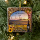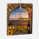 Wine themed Christmas ornament featuring a painting of a Roman arch with lantern and grapes overlooking a vineyard landscape at sunset. You can add your own (funny or other) texts.